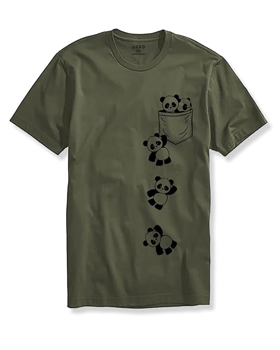 Olive green half sleeve round neck t-shirt featuring cute panda character graphic print placed vertically on the back side. Back straight display view with full t-shirt clearly visible, plain clean background and natural fabric fall showing comfortable casual regular fit. Ideal for daily wear, streetwear styling, college and casual outings with jeans, cargos or joggers.