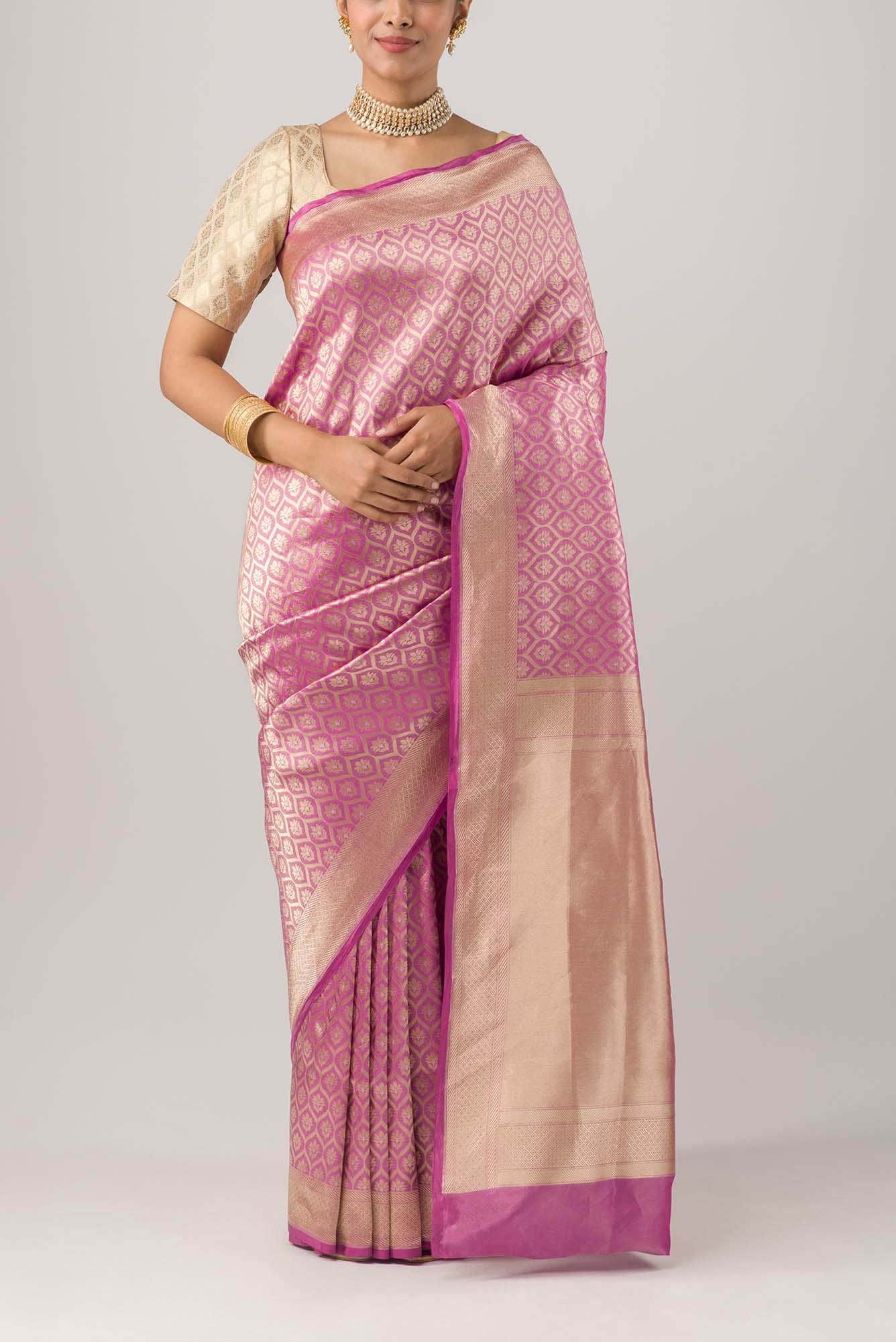 Immerse in the elegance of the Antara – Banarasi Saree, featuring floral butas within a lattice grid. The zari border harmonizes diamond twill patterns with delicate twill lines. A solid golden zari pallu completes the design, echoing the border’s elements, creating a timeless symphony of tradition and sophistication.