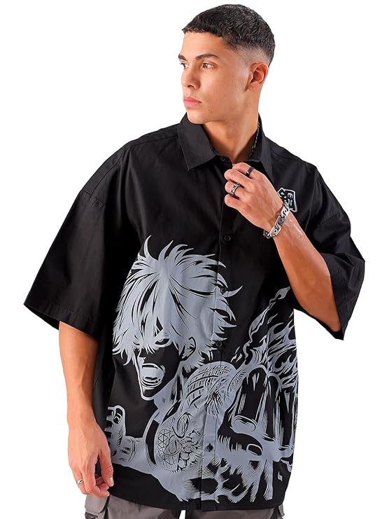 Trendy anime graphic oversized shirt featuring bold character artwork for a street style vibe, lightweight breathable fabric keeps you comfortable and stylish, perfect for hangouts, college and casual outings with jeans or cargos.