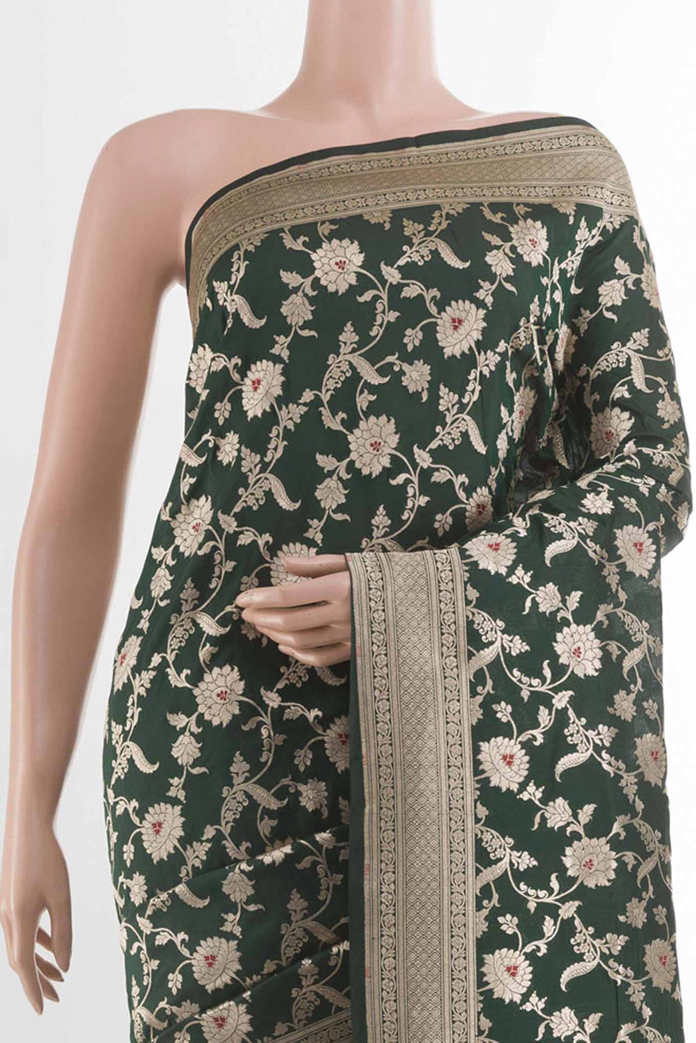 Bottle Green Banarasi Silk Saree with Zari Brocade on the body and Zari Border. Includes unstitched blouse.