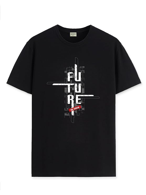 Black half sleeve round neck t-shirt featuring futuristic tech style typography graphic printed on front center area. Front straight display view with full t-shirt clearly visible, clean plain background and proper fabric fall showing comfortable regular casual streetwear fit. Ideal for daily wear, college, outings and casual styling with jeans, cargos or joggers.