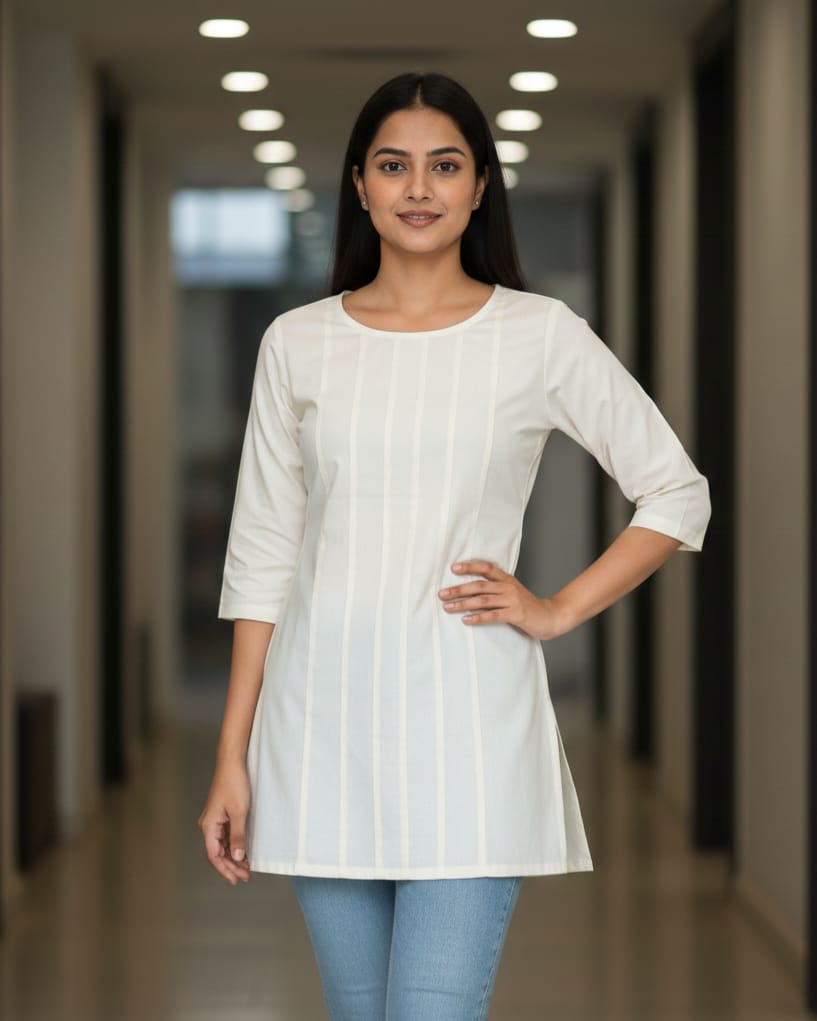 A refined panel style short kurti top designed for a clean modern appearance. The premium fabric offers comfort throughout the day while the neat panel stitching enhances its elegant look. Suitable for daily wear, outings and casual occasions, this waist-length top pairs easily with denim to create a stylish and confident outfit.