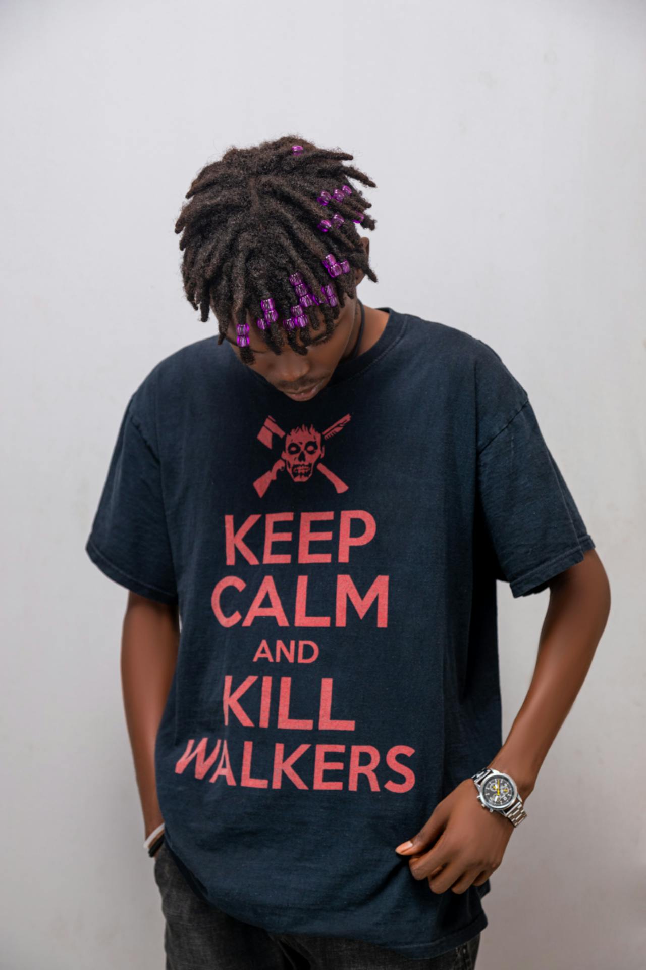 Dark navy blue half sleeve round neck oversized t-shirt featuring bold “KEEP CALM AND KILL WALKERS” graphic print with skull icon on the chest. Front facing male model with full face visible in a natural standing pose, casual streetwear styling. Clear fabric fall and relaxed fit look with clean background suitable for everyday wear and outings.