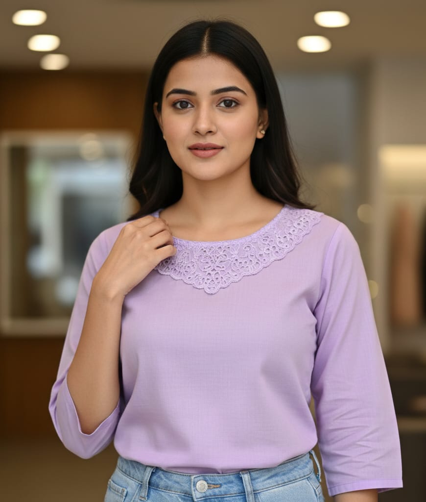 A delicate lace neck short kurti top designed for elegant everyday styling. The soft breathable fabric ensures comfort while the fine lace detailing enhances its feminine appearance. Suitable for outings, college and casual gatherings, this waist-length top pairs beautifully with denim to create a graceful modern look.