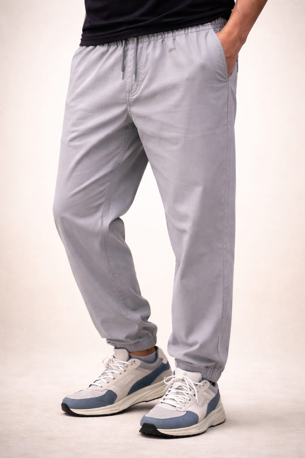 These light grey jogger pants are crafted for everyday comfort with a modern sporty look. Designed with an elastic waistband, adjustable drawstring, and elastic cuffed ankles, they provide a relaxed yet stylish fit. Perfect for daily wear, travel, and casual outings, they pair effortlessly with sneakers and t-shirts.