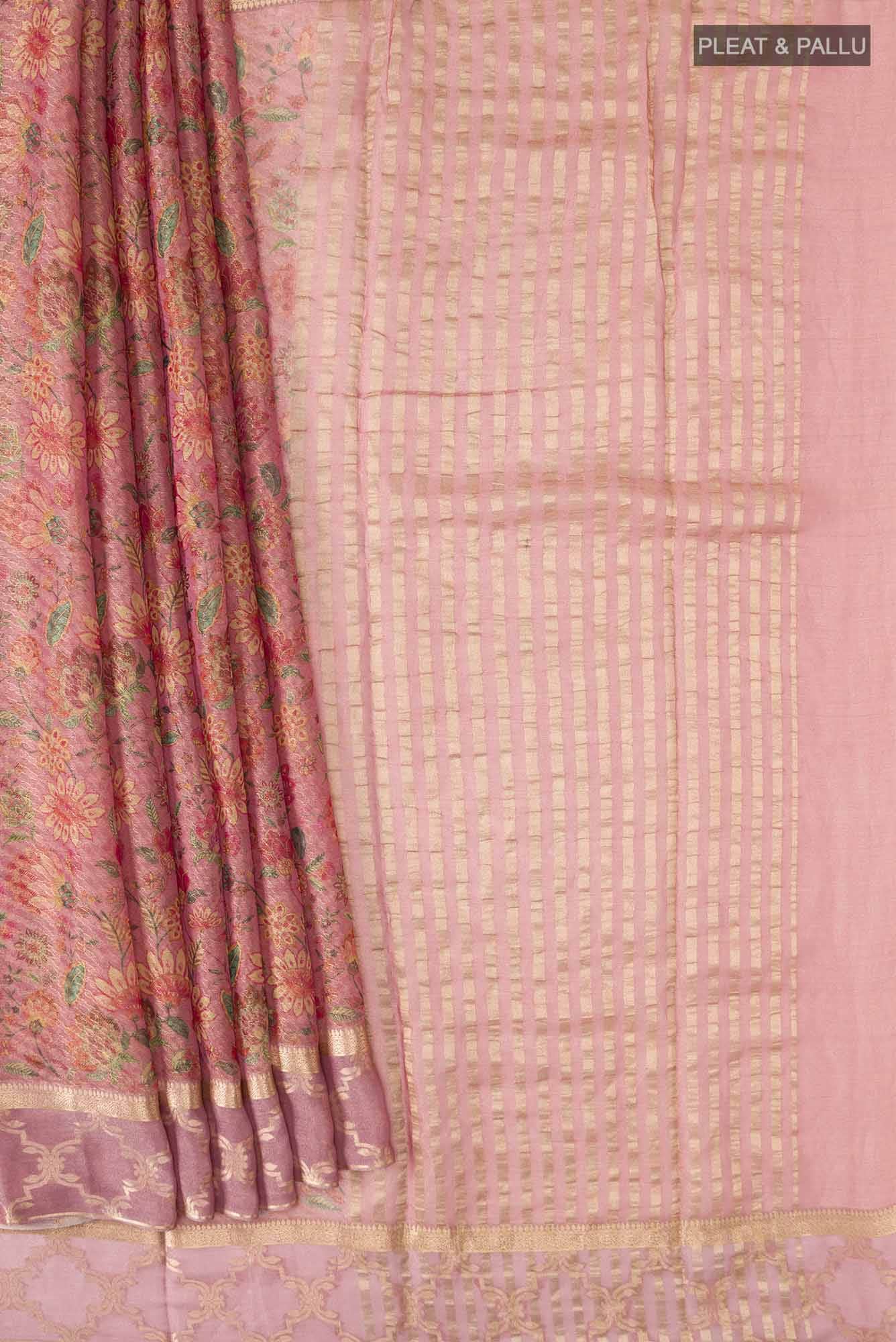 Mauve Banarasi Georgette SareePrinted design on the body and Zari Border. Includes unstitched blouse.