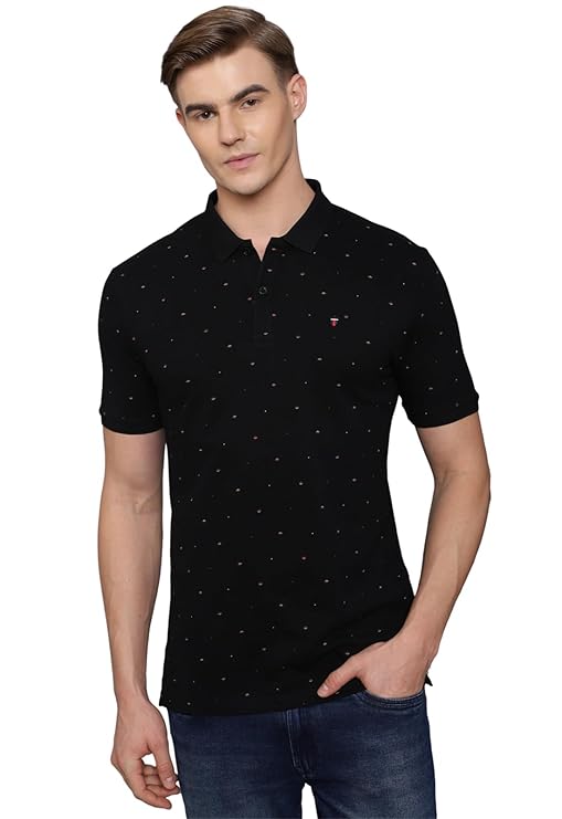 Black short sleeve polo T-shirt with all-over micro dotted print and stylish mandarin collar neckline. Lightweight breathable knitted fabric provides comfortable wear for daily use, college and casual outings. Pairs well with jeans or chinos for a clean smart look.
