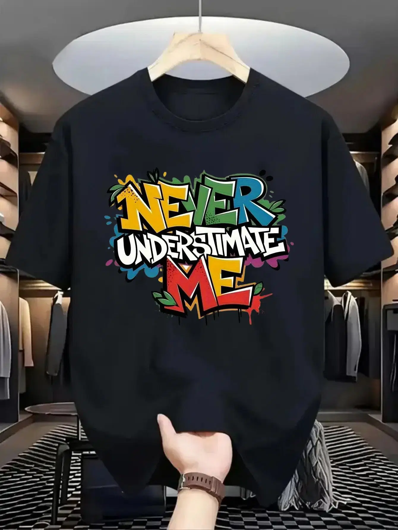 This navy blue t-shirt features a colorful “Never Give Up” graphic print on the front giving a bold motivational and trendy streetwear look. The vibrant typography design makes it eye-catching and perfect for modern casual outfits.