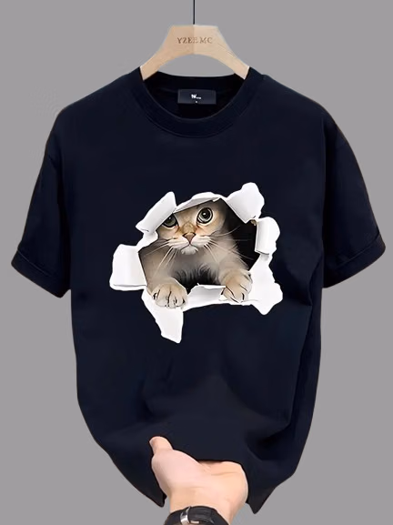 This t-shirt comes in a deep navy blue color featuring a bold shark graphic bursting through a ripped wall effect on the front. The 3D illusion style design gives a powerful and eye-catching streetwear look, perfect for modern casual fashion.