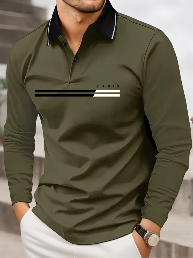 This t-shirt comes in an olive green color featuring a modern zip placket style with a clean minimal stripe detail on the chest. The smart collar design gives a classy and semi-formal look, perfect for both casual and smart casual outfits.