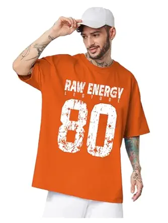 Orange printed graphic T-shirt featuring bold “Varsity 80” style front design giving sporty streetwear look. Made from soft breathable cotton blend fabric comfortable for daily wear and summer use. Round neck half sleeve pattern keeps style casual and easy to pair with jeans or shorts.
