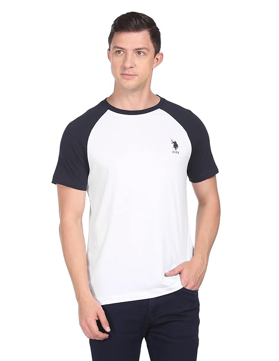 White and black raglan half sleeve T-shirt featuring sporty contrast sleeves and round neck design. Soft breathable cotton knit fabric gives comfortable feel for daily wear in all seasons. Ideal for casual outings, college and everyday use with jeans or shorts.