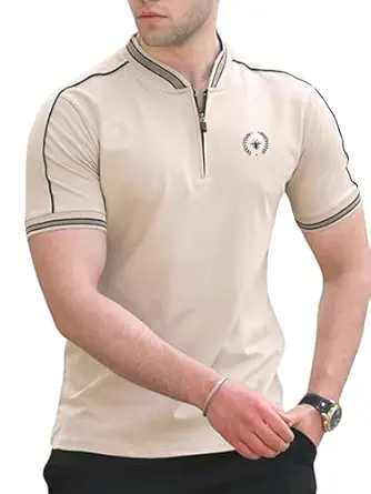 Half sleeve polo t shirt with modern zip collar, contrast tipping on collar and sleeves, and clean minimal look. Comfortable everyday casual wear suitable for summer, outings and daily styling. Pairs easily with jeans and sneakers for a sharp appearance.