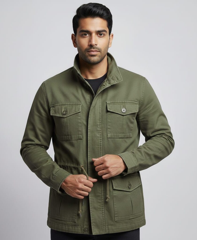 A rugged heritage field jacket crafted from heavy-duty olive green canvas. It features four spacious front utility pockets with reinforced stitching and antique brass snap buttons. The internal drawstring at the waist allows for a custom fit, while the durable fabric provides a classic military-inspired aesthetic. Perfect for outdoor adventures and transition weather.
