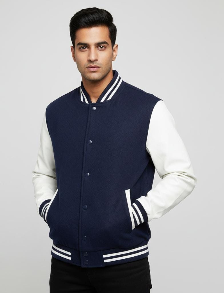 Classic collegiate-style navy blue varsity jacket with contrasting white faux-leather sleeves. Features a striped ribbed collar, cuffs, and hem for an authentic athletic look. Made from a premium wool-blend body with snap-button closure and two front welt pockets. Perfect for a sporty, youthful vibe during mild winters.