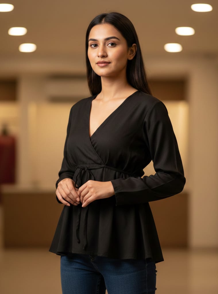 An elegant tie-up short kurti top designed for stylish evening and outing wear. The smooth rayon silk fabric gives a refined finish while the V-neck tie detailing adds a modern fashionable touch. Comfortable yet sophisticated, this waist-length top pairs beautifully with denim to create a confident and graceful look suitable for dinners, gatherings and special occasions.