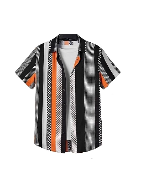 Trendy vertical striped casual shirt featuring eye-catching contrast colors and modern summer style, comfortable breathable fabric keeps you cool and stylish, perfect for outings, vacations and daily wear with jeans or shorts.