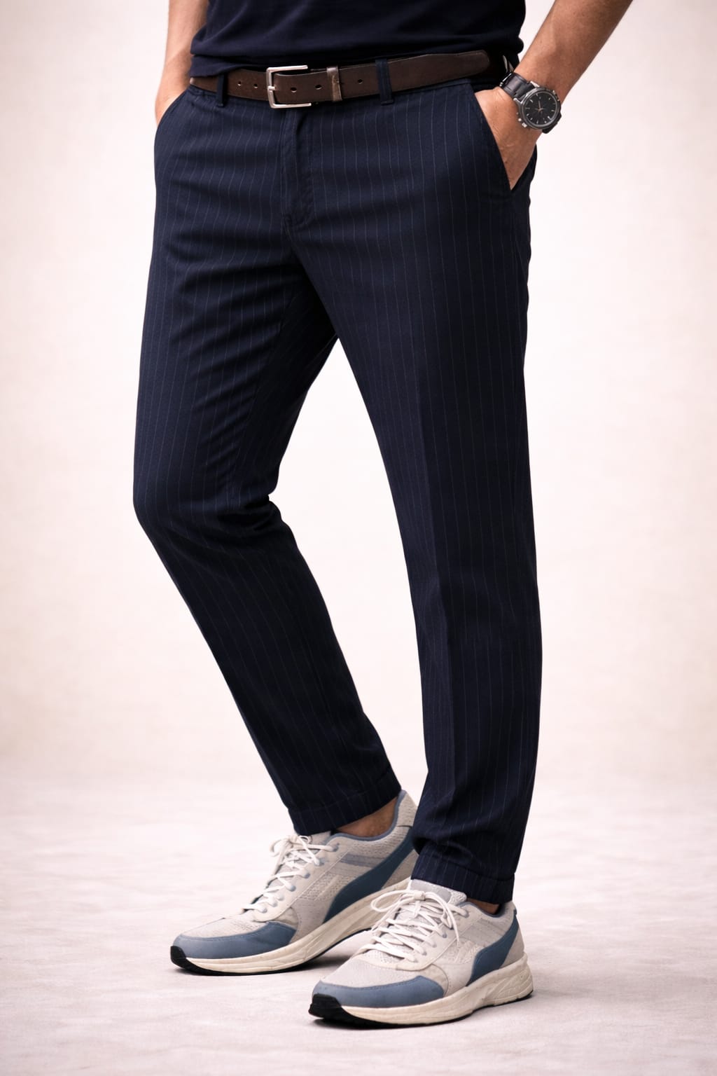 These navy slim fit pinstripe trousers deliver a sharp and modern look with a clean tailored finish. Designed for casual wear and smart outings, they pair easily with jeans style tops, shirts or blazers for daily wear, travel, office meetings and comfortable all-day movement with a refined feel.