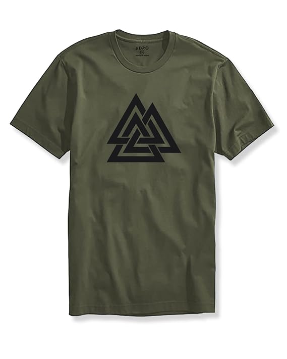 Olive green half sleeve round neck t-shirt featuring bold triple triangle nordic symbol graphic printed on front center area. Front straight display view with full t-shirt clearly visible, plain background and proper fabric fall showing comfortable regular casual streetwear fit. Perfect for everyday wear, outings and casual styling with jeans, cargos or joggers.