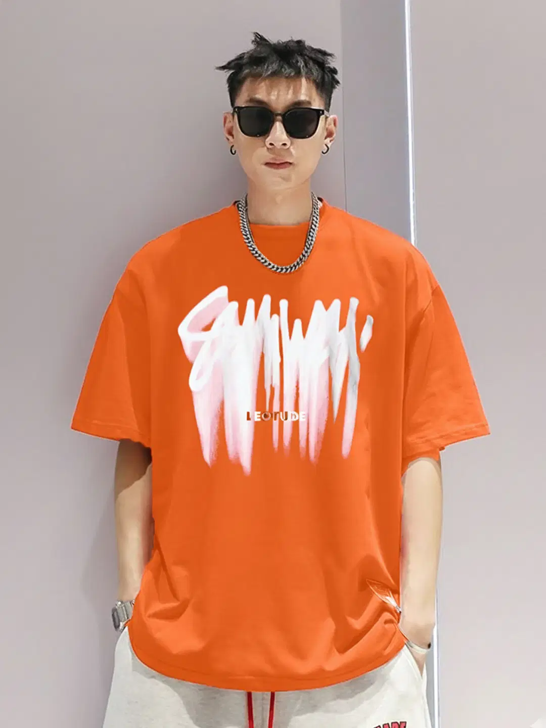 This t-shirt features a bold orange color with a modern scribble style graphic print on the front that gives a strong streetwear and trendy fashion vibe. The oversized fit provides a relaxed and stylish look, perfect for boys who prefer fashionable casual outfits. The design stands out and makes the outfit eye-catching and confident.
