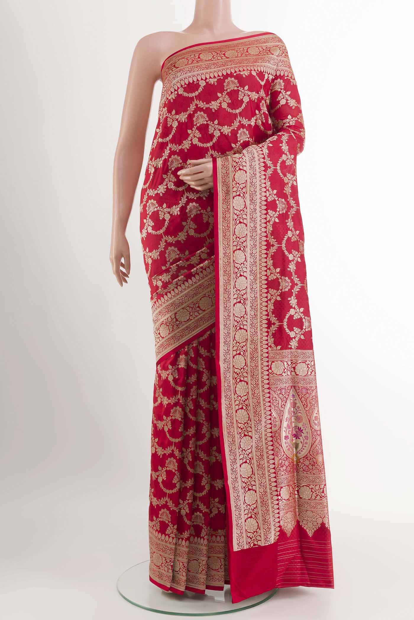 Red Banarasi Silk Saree with Zari Brocade on the body and Zari Border. Includes unstitched blouse.