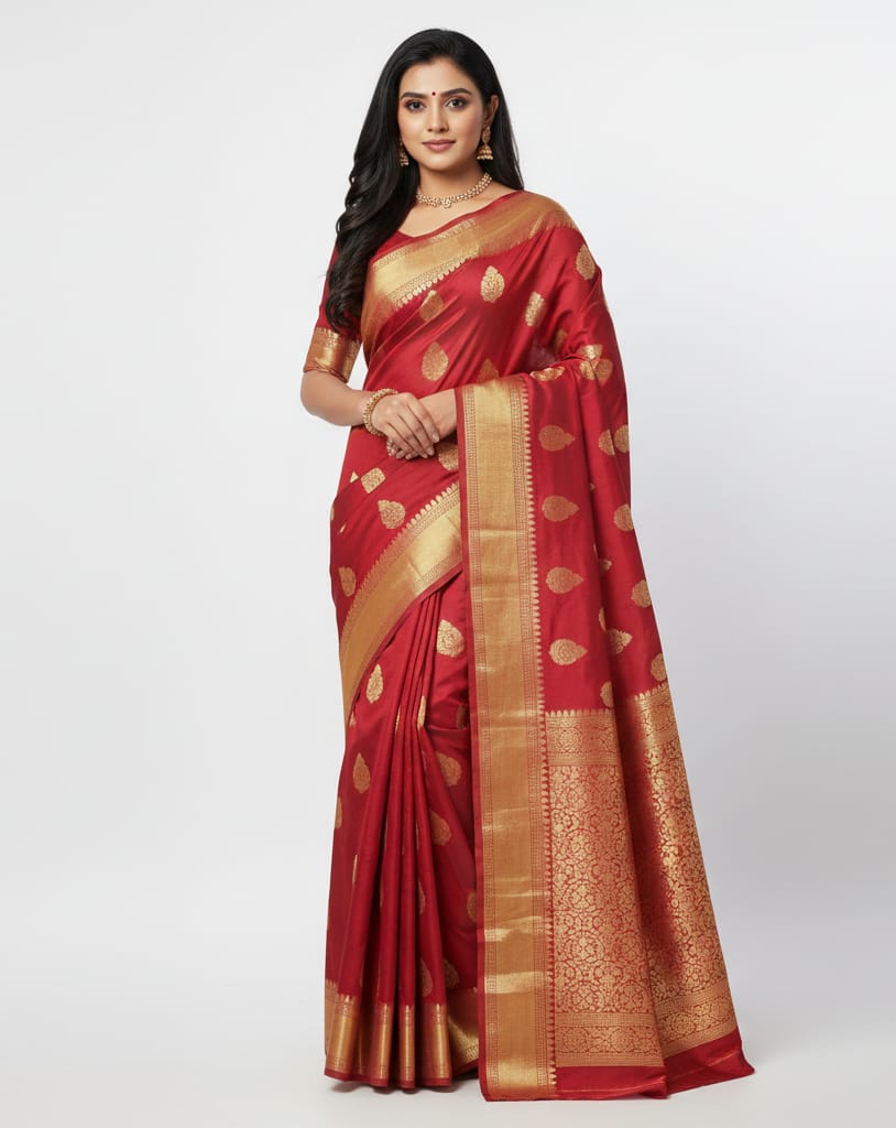 A luxurious Kanjivaram silk saree crafted for grand weddings and festive celebrations. The rich ruby red color combined with detailed golden zari weaving gives a royal traditional appearance. The heavy pallu and premium silk fabric create a graceful drape that enhances elegance and presence. Perfect for bridal functions, receptions, and special occasions where a rich and classy ethnic look is desired. Designed to offer both comfort and a premium look, making it a timeless addition to any wardrobe.