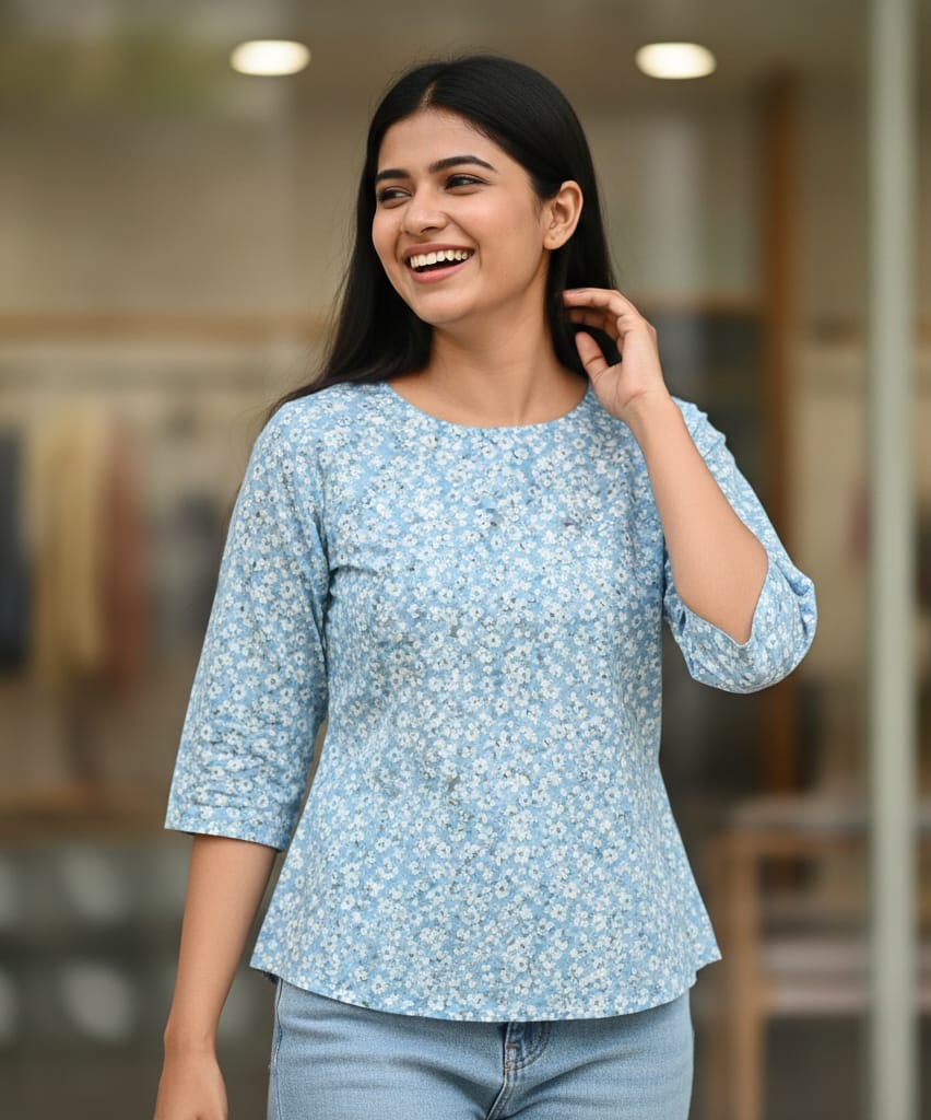 A fresh floral short kurti top designed for comfortable summer styling. The breathable cotton fabric keeps you cool while the delicate floral pattern adds a cheerful modern touch. Suitable for college, outings and everyday wear, this waist-length top pairs easily with denim to create a relaxed and stylish look.