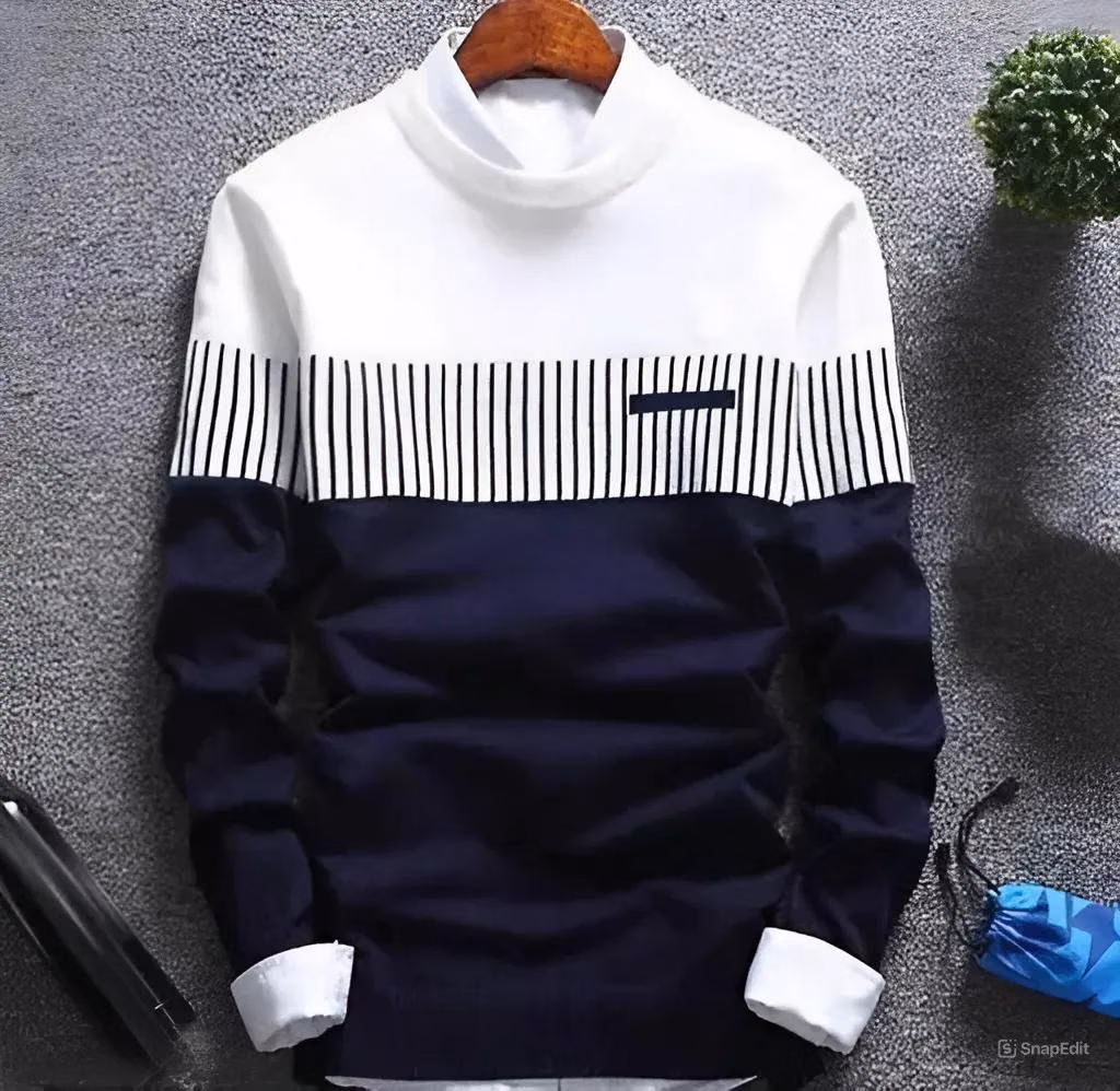 Stylish winter high neck sweatshirt featuring clean white upper panel with vertical stripe pattern and contrast navy lower body and sleeves giving premium modern look. Displayed on hanger with full garment clearly visible, neat background highlighting fabric texture and comfortable regular winter fit. Ideal for cold weather casual wear, college outfits and everyday fashion, pairs perfectly with jeans, joggers and sneakers.