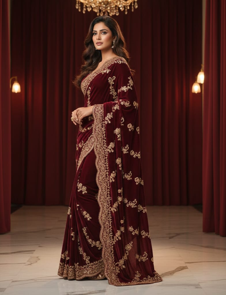 An exquisite velvet designer saree created for luxurious evening occasions and grand celebrations. The rich wine shade combined with detailed embellishment embroidery gives a deep royal appearance while maintaining a modern stylish presence. The soft velvet fabric drapes smoothly and enhances the overall silhouette, offering both comfort and elegance for long events. Ideal for receptions, cocktail parties and premium gatherings, this saree reflects sophistication and confidence, making it a perfect choice for those who want a bold yet graceful fashion statement.